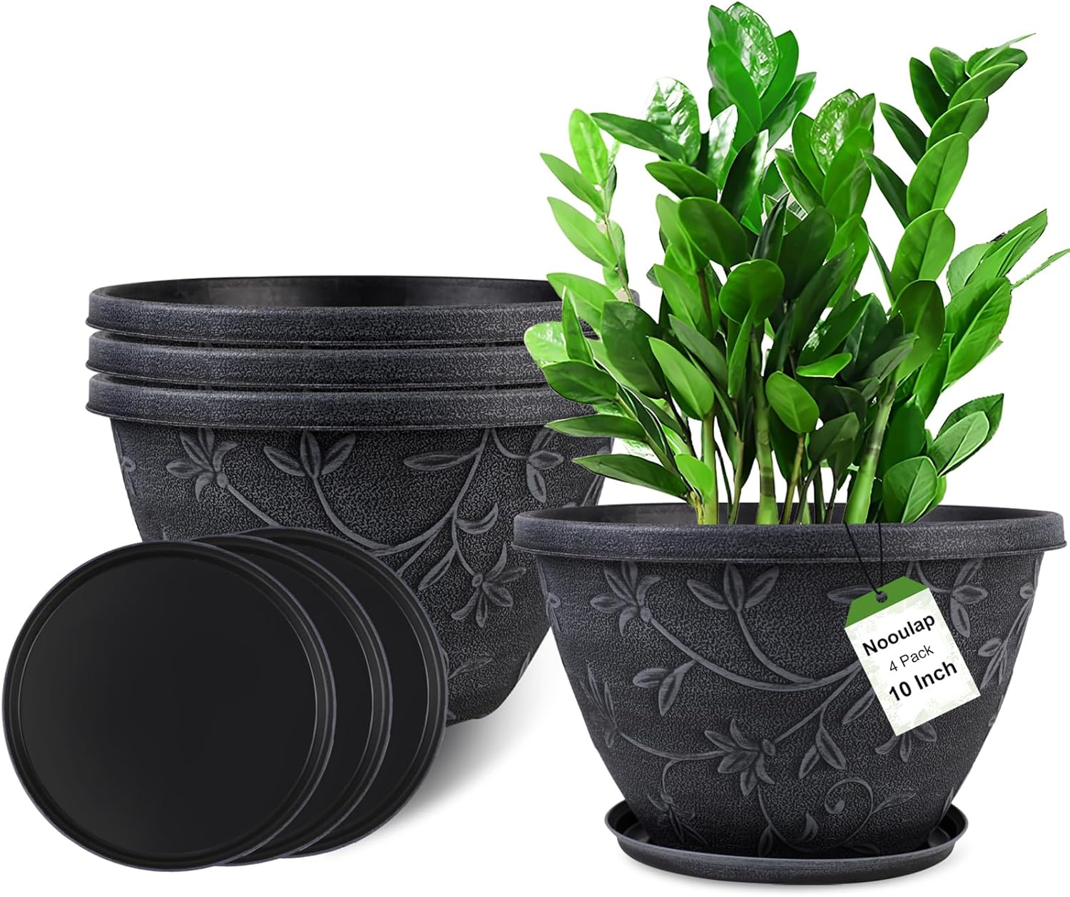 4 Pack 16 Inch Large Plant Pot for Outdoor, Plastic Flower Pot Indoor with Drainage Hole & Saucer, Modern Decorative Garden Pot, Imitation Magnolia Garden Pots for House planters(Gray)